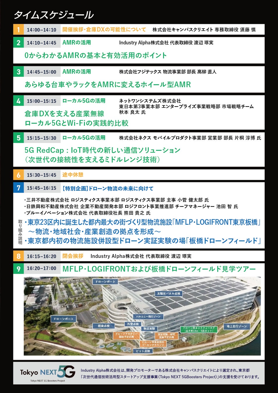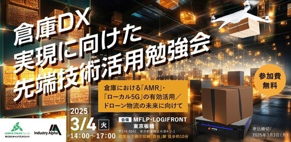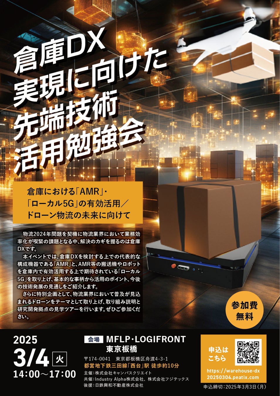 2025年3月4日(火)、株式会社キャンパスクリエイトおよびIndustry Alpha株式会社、株式会社フジテックスは、「倉庫DX実現に向けた先端技術活用勉強会 ~倉庫における「AMR」・「ローカル5G」の有効活用/ドローン物流の未来~に向けて」を開催します。倉庫DXに関心がある物流事業者様、倉庫保有者様、ベンダーの方々など、ぜひご参加くださいませ。