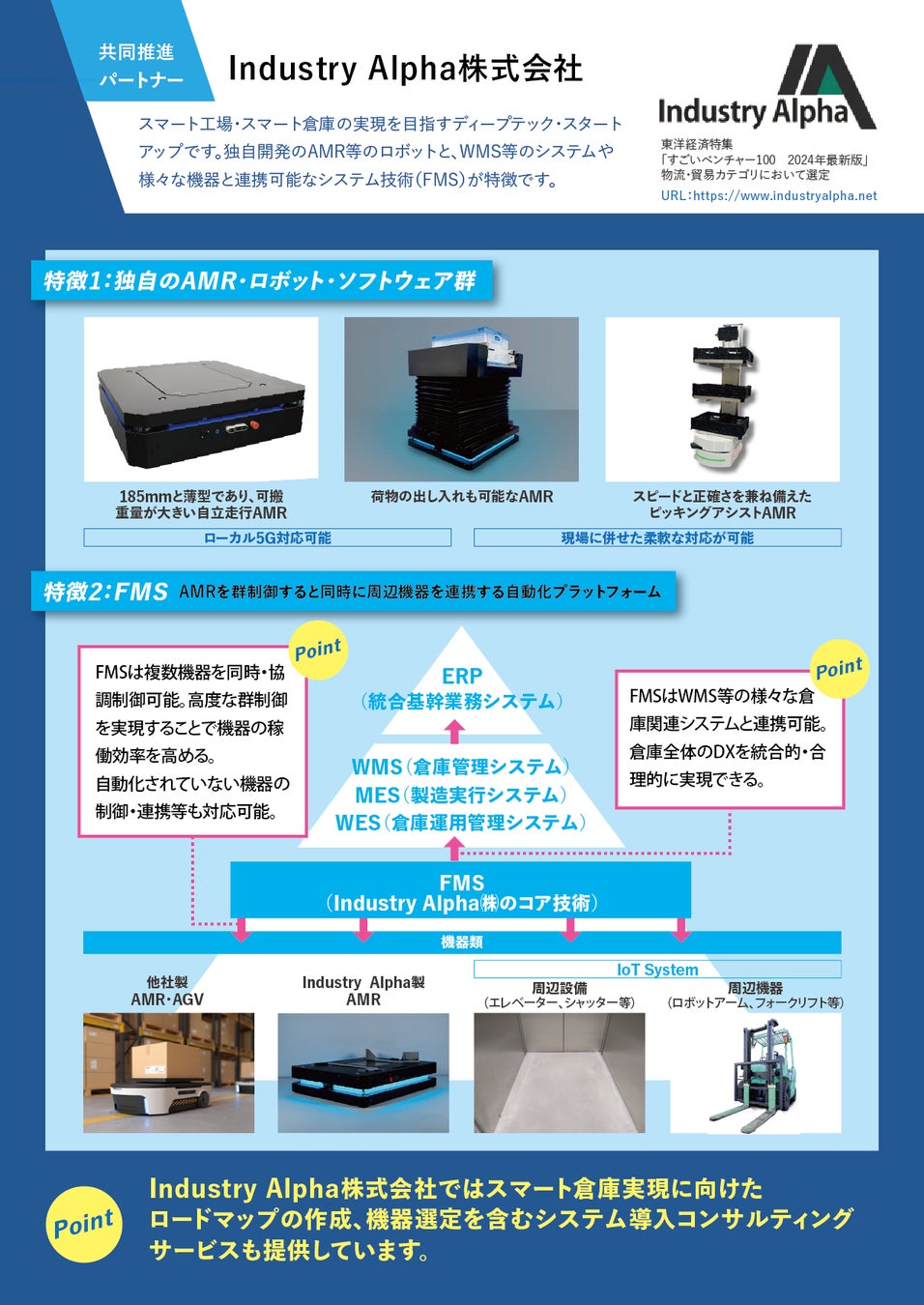 Industry Alpha株式会社は工場・倉庫のスマート化のパートナーとして様々なソリューションを開発・導入するスタートアップです。磁気テープ等のガイドを必要としないAMRに強みを持ち、ハードウェア・ソフトウェア両面での独自設計・内製によって、大手製造・物流企業から高い評価を受けています。中でも低床型AMRのKagheloは、500kg可搬と1000kg可搬の2モデルを展開しており、薄さ(500kg可搬モデルで185mm)と重量可搬を両立した機体性能やカスタマイズ性で注目を浴び、数々の産業用製品比較サイトの無人搬送車部門で1位を獲得しています。また、AMRやAGVを群制御し、工場・倉庫内の様々な設備・システムと連携する独自のFMS(Fleet Management System)を開発・導入し、工場・倉庫内の自動化プラットフォームを構築することで、日本の製造・物流業に貢献します。