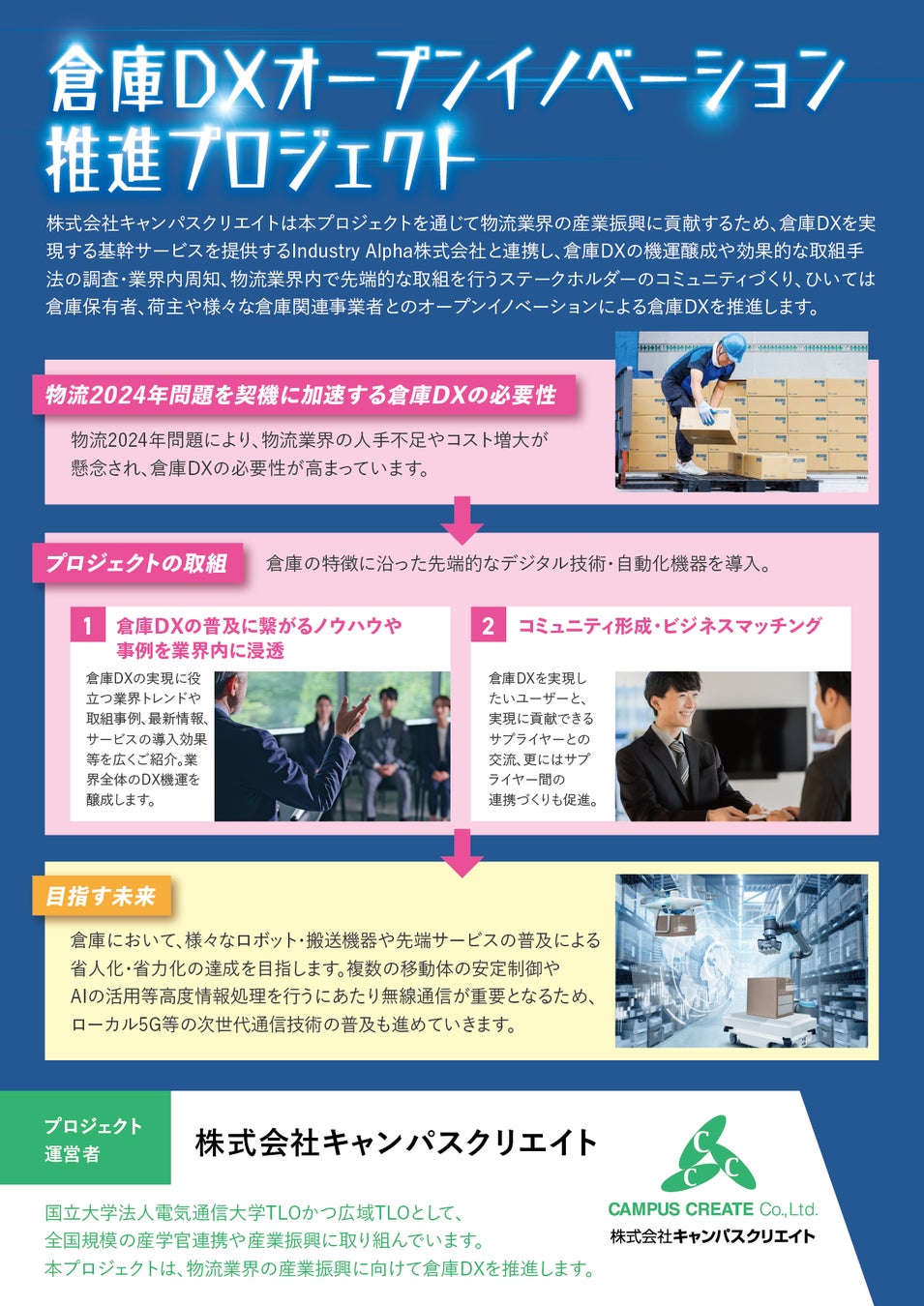株式会社キャンパスクリエイトは物流業界の産業振興に貢献するため、倉庫DXを実現する基幹サービスを提供するIndustry Alpha株式会社と連携し、倉庫DXの機運醸成や効果的な取組手法の調査・業界内周知、物流業界内で先端的な取組を行うステークホルダーのコミュニティづくり、ひいては倉庫保有者、荷主や様々な倉庫関連事業者とのオープンイノベーションによる倉庫DXを推進します。