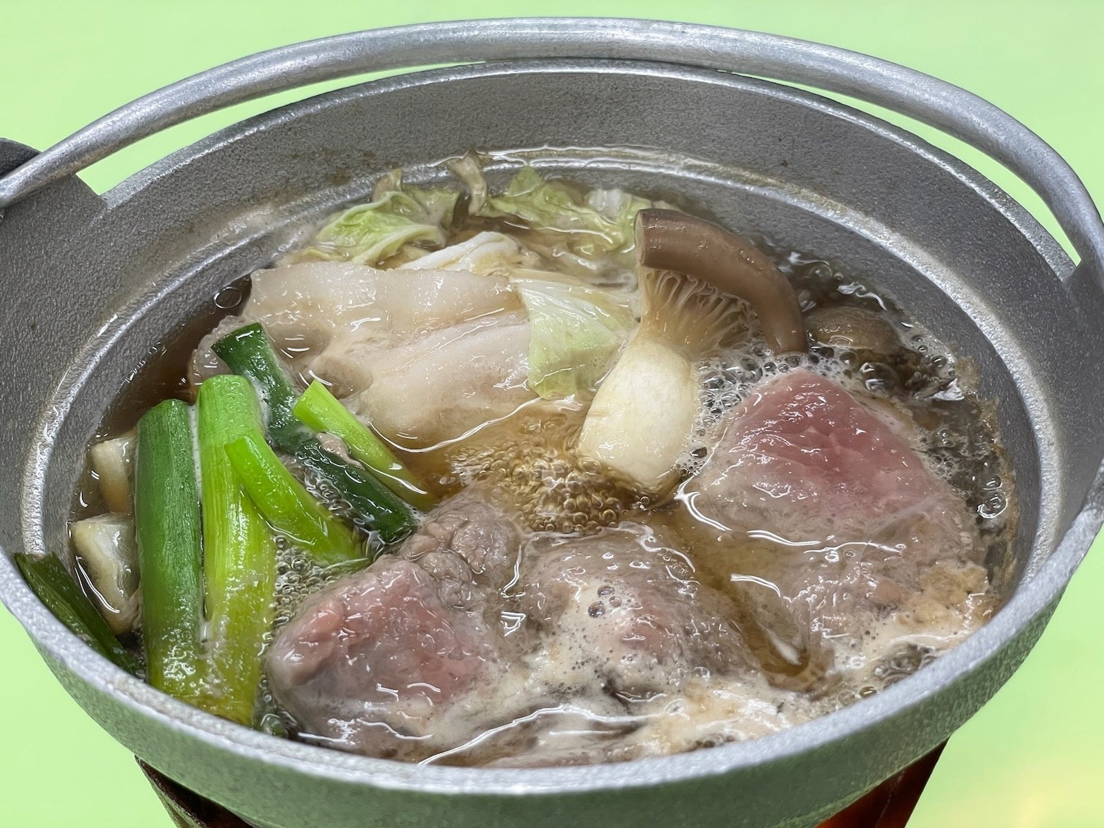 地元伊豆の豊かな自然が育んだ新鮮な野菜をたっぷり使った贅沢な一品です。旨味あふれる牛肉を特製割り下でじっくり煮込みました。野菜の甘さと牛肉の旨味が溶け合い、奥深い味わいに仕上がっています。