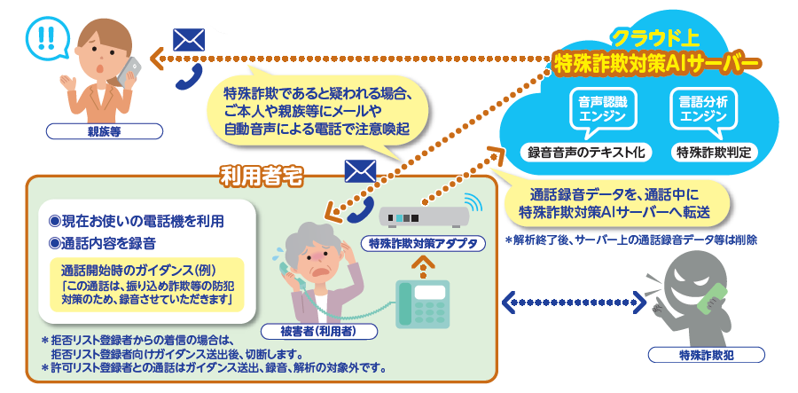 実際の特殊詐欺犯の音源を元に学習した特殊詐欺対策AIサーバーが、通話録音データを解析し、特殊詐欺等の疑いがある場合は、事前に登録したご本人やご親族等に対してメールや電話で通知し、注意喚起を行います。これにより、ご本人やご親族等が特殊詐欺等の危険性を察知することが可能となります。