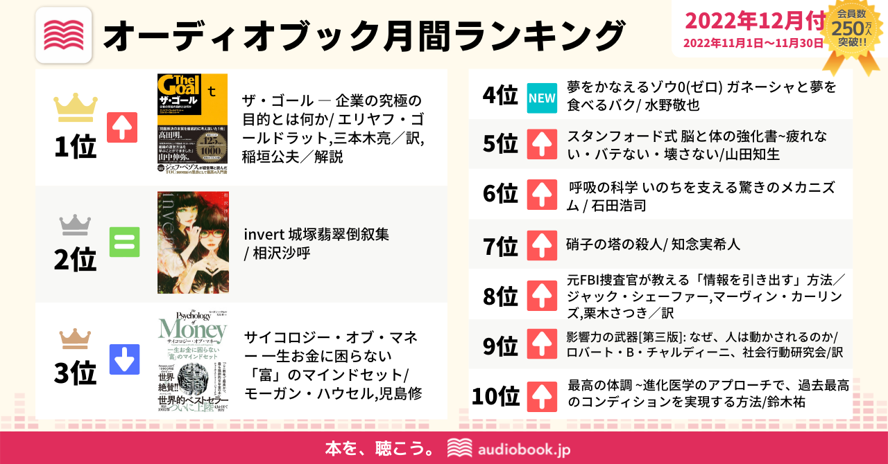 日本一のオーディオブック書籍ラインナップ数(※)を配信する「audiobook.jp」を運営する株式会社オトバンク( 本社:東京都文京区、代表取締役社長:久保田裕也、以下「オトバンク」)は、当社が運営する会員数が250万人を突破した日本最大級のオーディオブック配信サービス「audiobook.jp」におけるオーディオブック月間ランキング12月付(2022/11/1~11/30)を発表します。