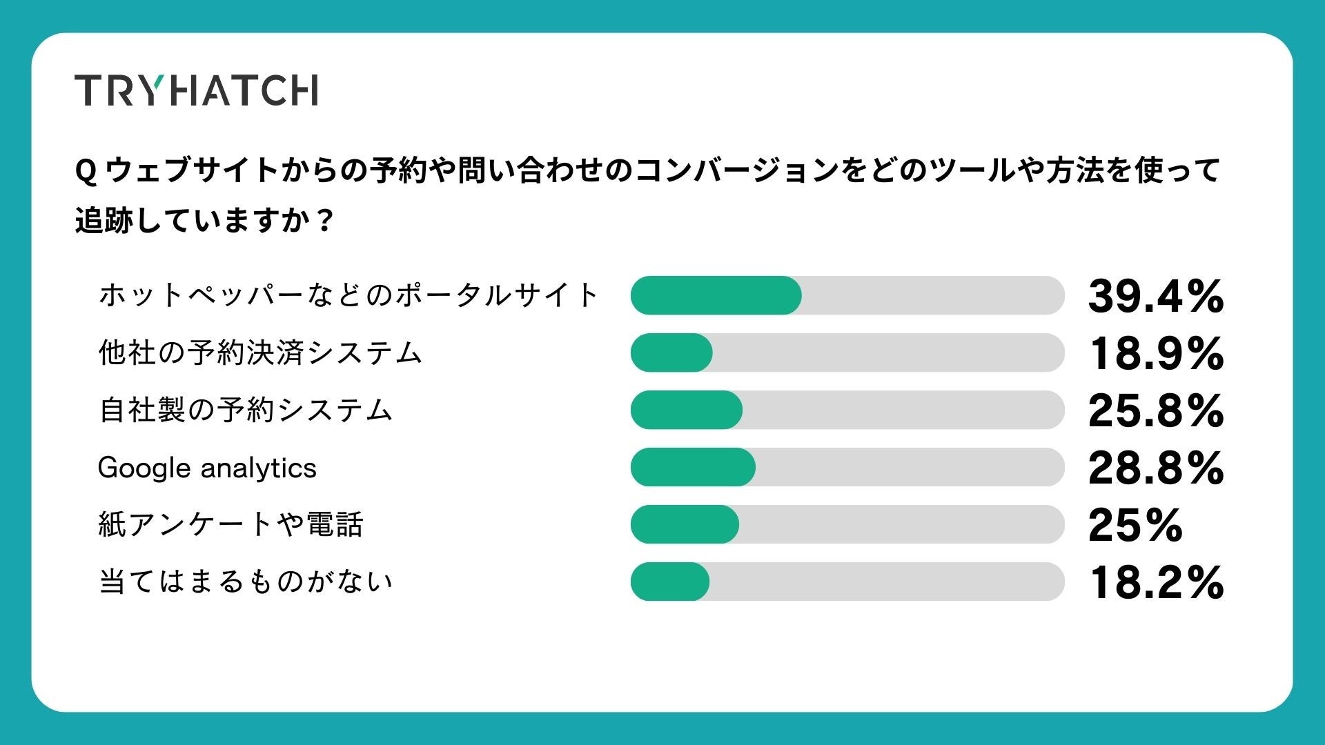 例えば、複数回答の設問において「ウェブサイトからの予約や問い合わせのコンバージョンでは、39.4%の企業がポータルサイトに依存していると回答しており、自社サイトや、Google Analyticsを利用している企業は30%を切る結果となりました。