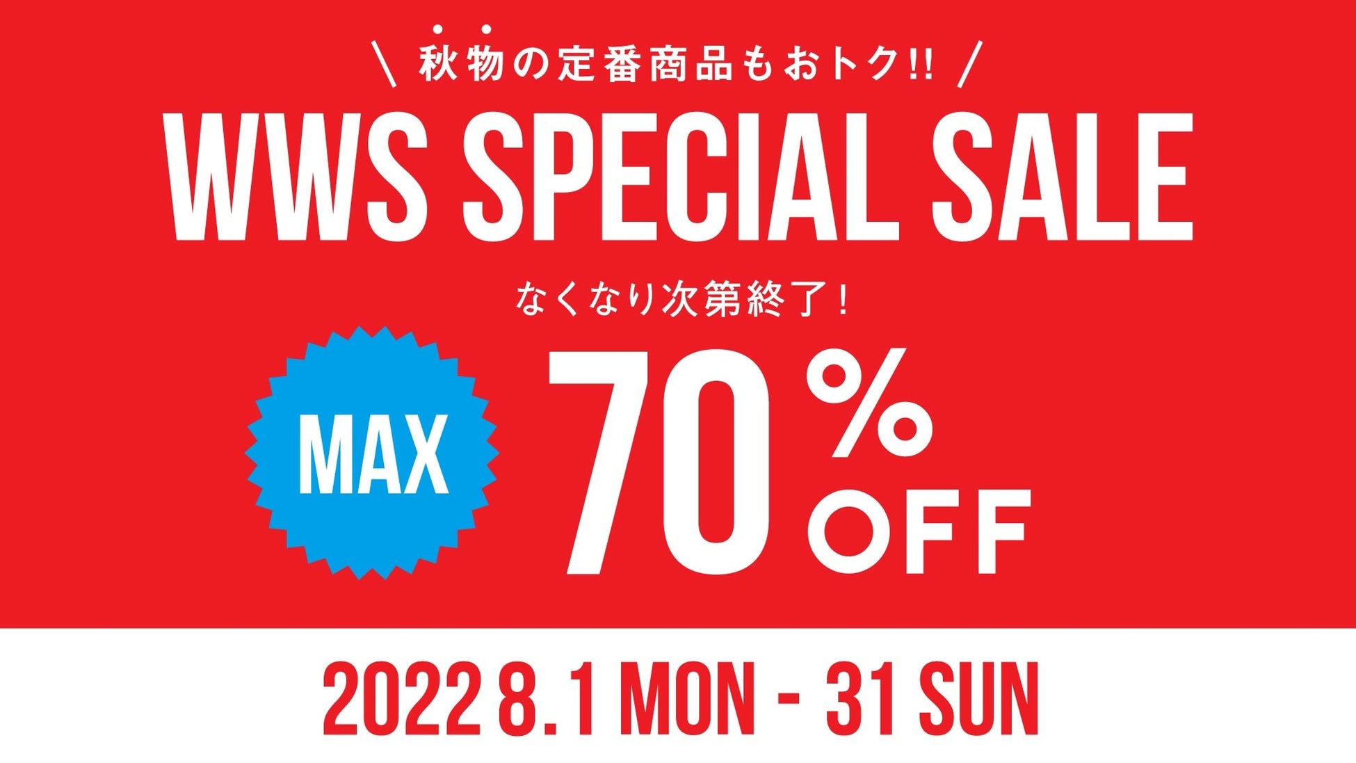 この度、8月31日(水)23:59まで、対象商品が最大70%オフになる「WWSスペシャルセール」を実施いたします。同セールは、WWS公式オンラインストア・WWS Flagship Store 新宿・WWS八重洲地下街店にて開催いたします。