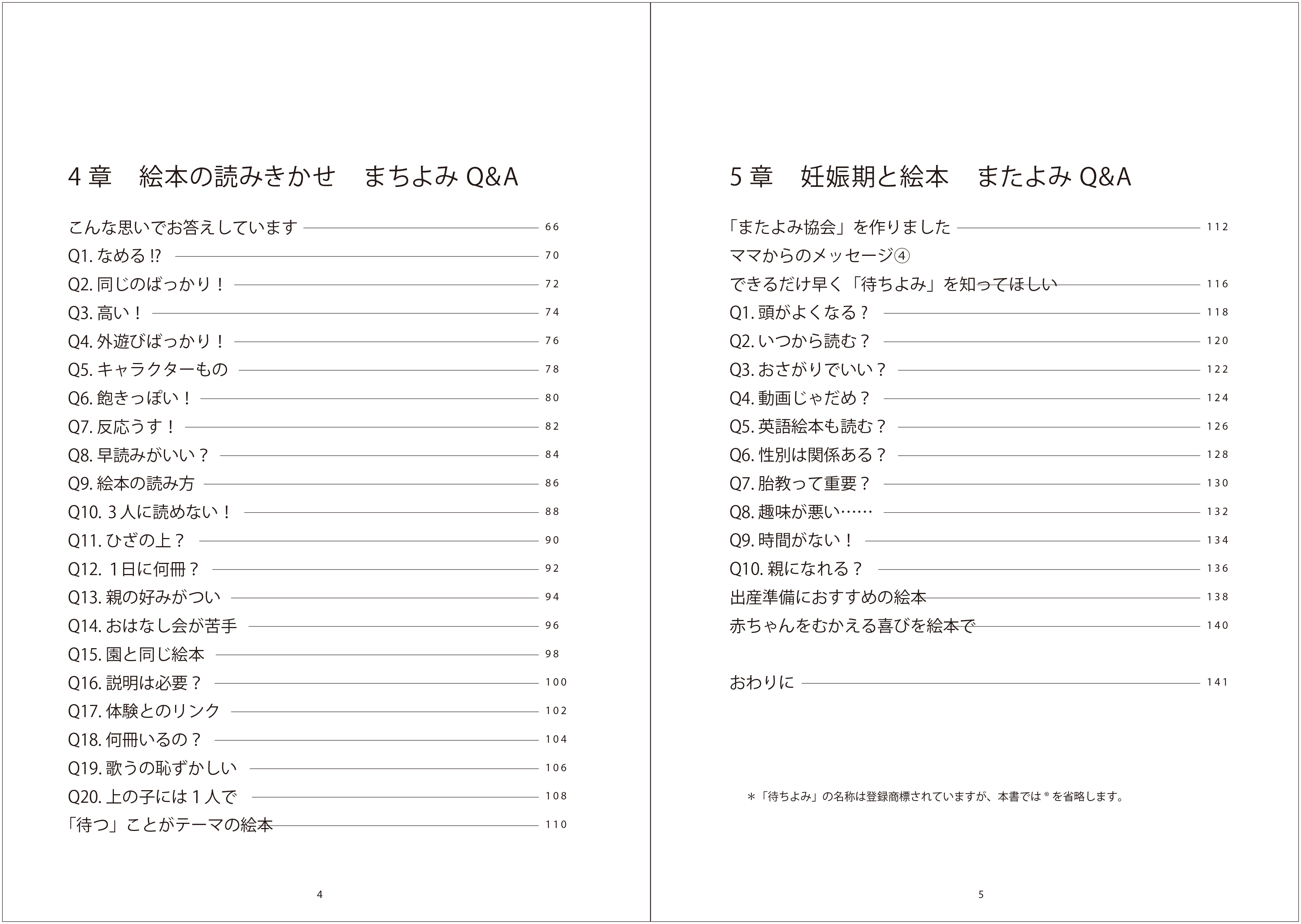 タイトルの「まちよみ」とは、「待つ」+「読む」を組み合わせた言葉。待ちながら読むとはどういうことなのか。待ちよみするとどんな効果があるのか。本書では今日からでも始められる「待ちよみ」のやり方や、実際に体験した方の声なども掲載。そして「またよみ」とは、「マタニティ」+「読む」で、妊娠中から赤ちゃんに読み聞かせることです。悩めるママとパパ、そして妊婦さんに必携の1冊!