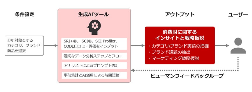 株式会社インテージ(本社:東京都千代田区、取締役社長:檜垣 歩、以下インテージ)は、全国約6,000店舗を対象とした小売店パネル調査(SRI+®)、全国約70,000人の消費者パネル調査(SCI®)、買い物アプリ「CODE」の口コミ・評価など、自社グループで保有する国内最大級のパネル調査データ群をインプットデータとし、生成AIによって分析からマーケティング戦略仮説の導出までを行うツールを開発しました。