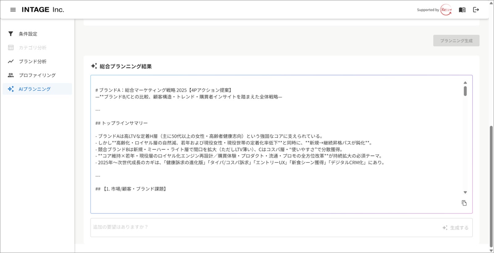 生成AIマーケティングプランニング (分析テーマ別/総合マーケティングプランニング機能)