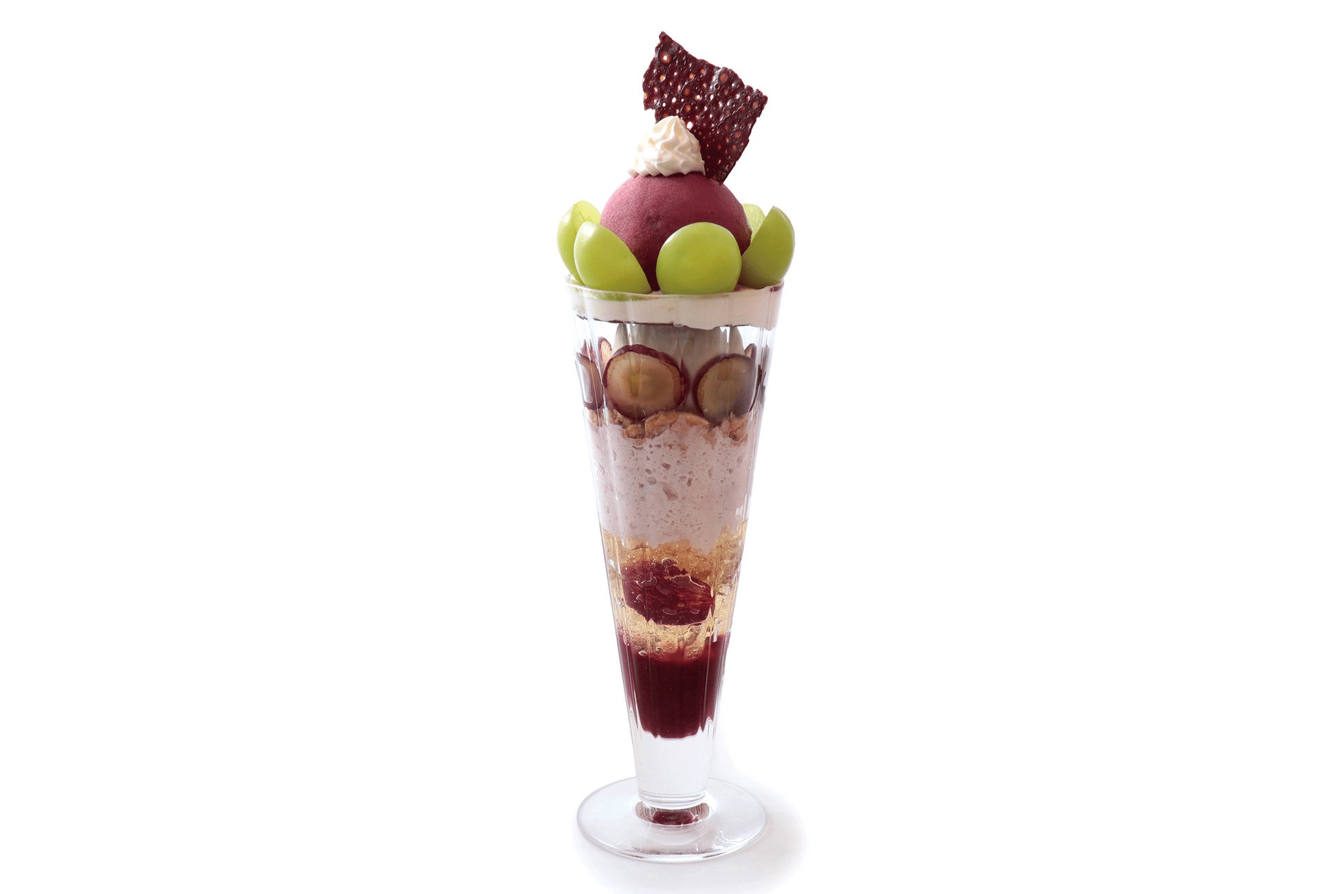 巨峰とシャインマスカットを使用したぶどう尽くしのリッチなパフェ。