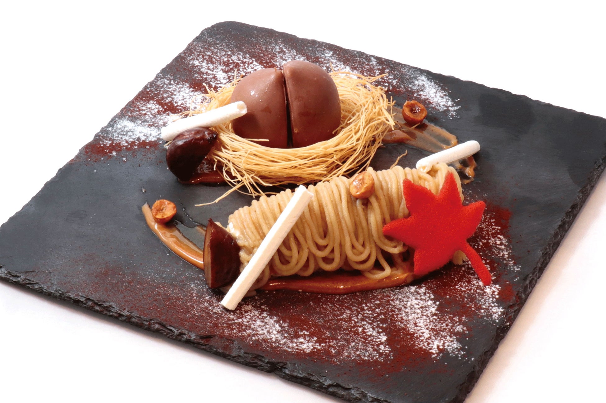 和栗のクリームや栗の渋皮煮などを盛り込み、秋をしっかりと感じて頂ける一皿です。