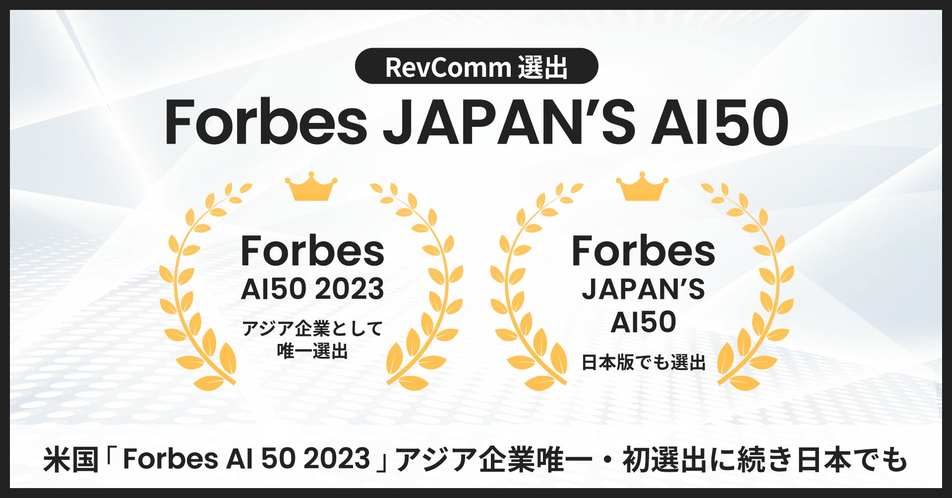 株式会社RevComm(レブコム、本社:東京都渋谷区、代表取締役:會田武史)は、米国「Forbes AI 50 2023 」にアジア企業唯一、初選出されたことに続き、日本でもフォーブス ジャパン編集部により、有力AIスタートアップの日本版50社を選出した「Forbes JAPAN’S AI 50」に選出されました。