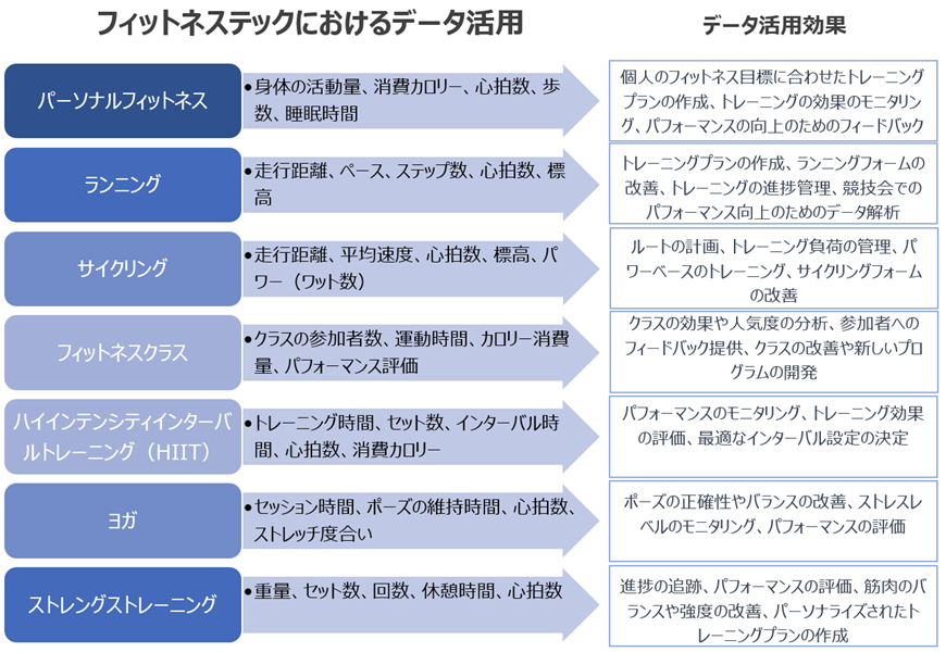 フィットネステックの活用範囲は多岐に渡り、さまざまな分野でデータが収集されます。パーソナルフィットネス、ランニング、サイクリング、フィットネスクラス、ハイインテンシティインターバルトレーニング(HIIT)、ヨガ、ストレングストレーニングなど、それぞれの分野において異なるデータが取得されます。これらのデータは、トレーニングプランの作成、パフォーマンスのモニタリング、効果的なフィードバックの提供など、個別のニーズに合わせた活用が行われます。フィットネステックがどのようにこれらのデータを活用し、各分野での具体的な活用方法について以下に説明します。
