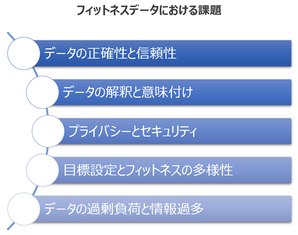 フィットネスデータの活用は、フィットネステック企業やフィットネス業界において重要な役割を果たしています。しかし、フィットネスデータにはいくつかの課題が存在します。フィットネスデータは、正確性や信頼性の確保、データの解釈と意味付け、プライバシーとセキュリティ、目標設定とフィットネスの多様性、そしてデータの過剰負荷と情報過多などが課題となっています。フィットネスデータにおける課題とは次のようになります。
