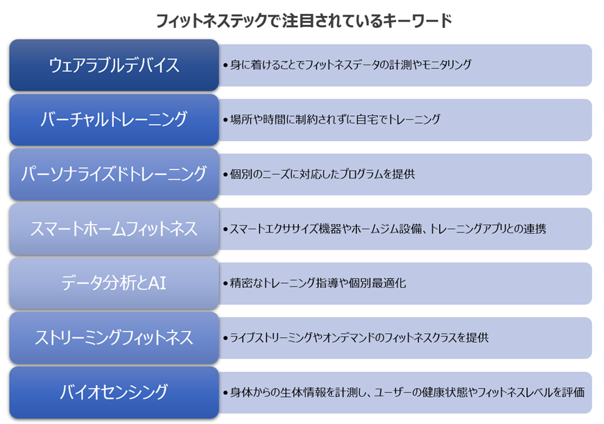 また、現代のフィットネスと健康管理の領域で急速に進化しています。最新のテクノロジーとイノベーションが組み合わさり、個人のフィットネス体験を向上させるための革新的な手段が提供されています。この領域では、人工知能(AI)、バイオセンシング、バーチャルリアリティ、オープンデータとAPI連携、モバイルアプリケーションとクラウドコンピューティング、そしてバーチャルトレーナーやAIアシスタントなど、さまざまな技術とトレンドが重要な役割を果たしています。フィットネステックのトレンドとなるキーワードは次のようになります。