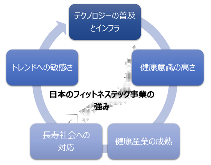フィットネステックは、日本は独自の強みを持っています。日本のテクノロジーの普及と高度なインフラ、健康意識の高さ、成熟した健康産業、長寿社会への対応、そしてトレンドへの敏感さが、フィットネステックが日本市場で成功するための土壌を提供しています。