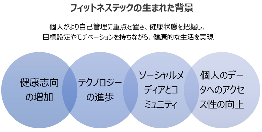 フィットネステックは、健康志向の増加、テクノロジーの進歩、ソーシャルメディアとコミュニティの発展、個人のデータへのアクセス性の向上などの要素によって生まれたものです。以下では、フィットネステックが生まれた背景について説明します。