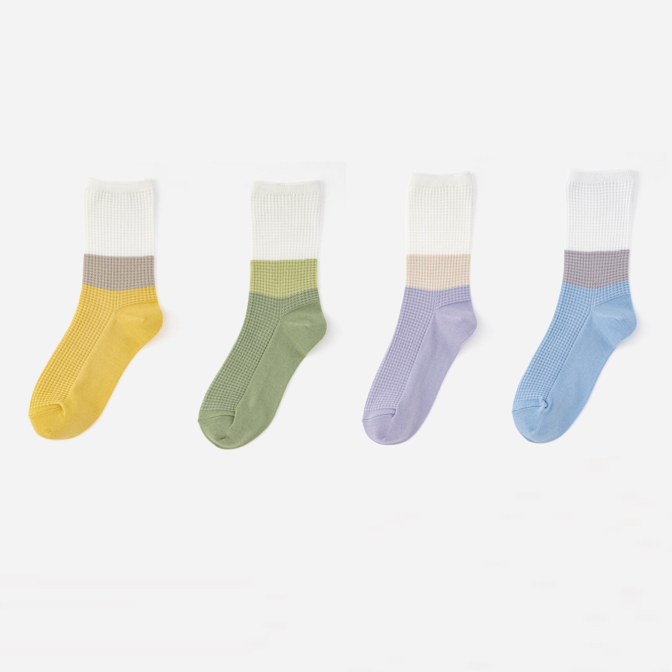 ペットボトルなどのリサイクル繊維を使用した調温靴下。発汗量で温度を調節する機能を持つ糸で、夏は涼しく冬は暖かく過ごせます。春夏らしい、さらっとした肌触りのカノコ編みと華やかなグラデーションカラーで仕上げました。吸水速乾・抗菌防臭糸使用で、汗が気になる季節も安心です。