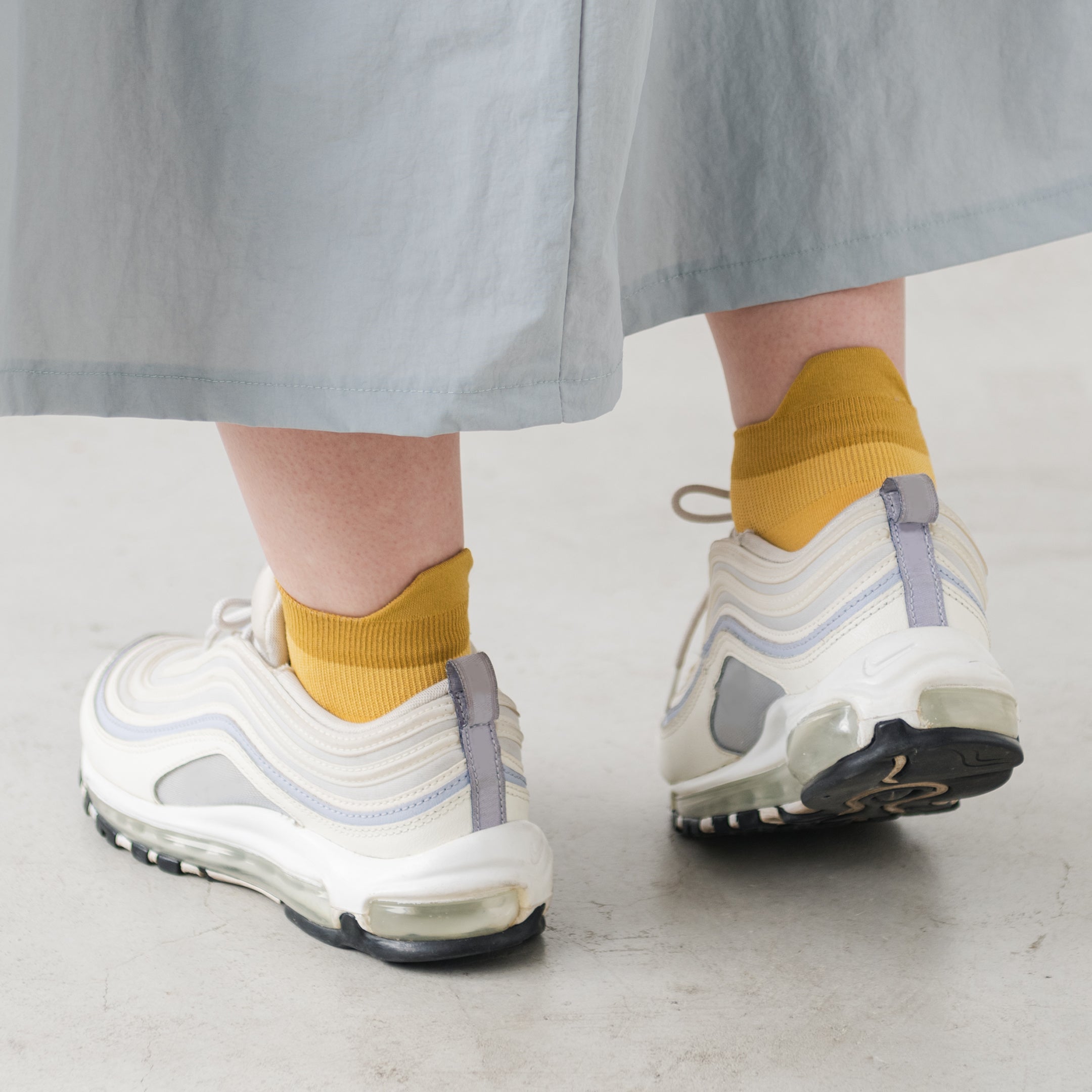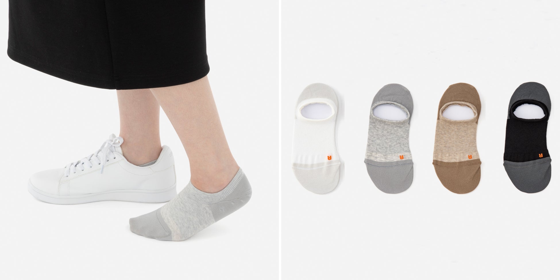 ほんのりと肌が透けるくらいの薄さながら、UVカット率90%以上の靴下。ストッキングのようにスルっと履けるナイロン素材で、キレイ目なコーディネートにもマッチします。暑い時期にも合わせやすく、足の甲の日焼け防止にもおすすめです。抗菌防臭糸使用で汗が気になる季節も安心です。