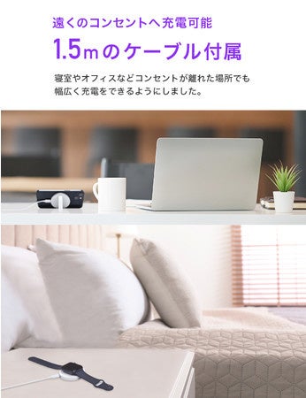 デスクの上や、サイドテーブル、オフィスなどコンセントが離れた場所でも幅広く充電できるよう、1.5mと長めのケーブルを付属。場所に左右されずご使用いただけます。