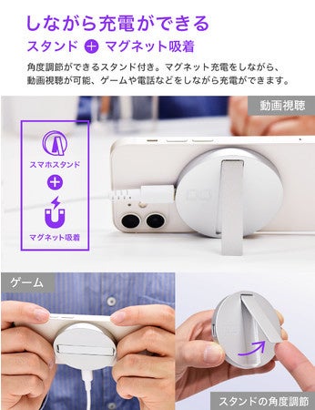 従来の充電のようにスマートフォンの電源コネクタ付近が邪魔にならなく、充電しながらスマートフォンの操作が可能、自由な角度で本体を自立させることができるので、ゲームや動画の視聴、料理の際のレシピチェックなどに便利です。