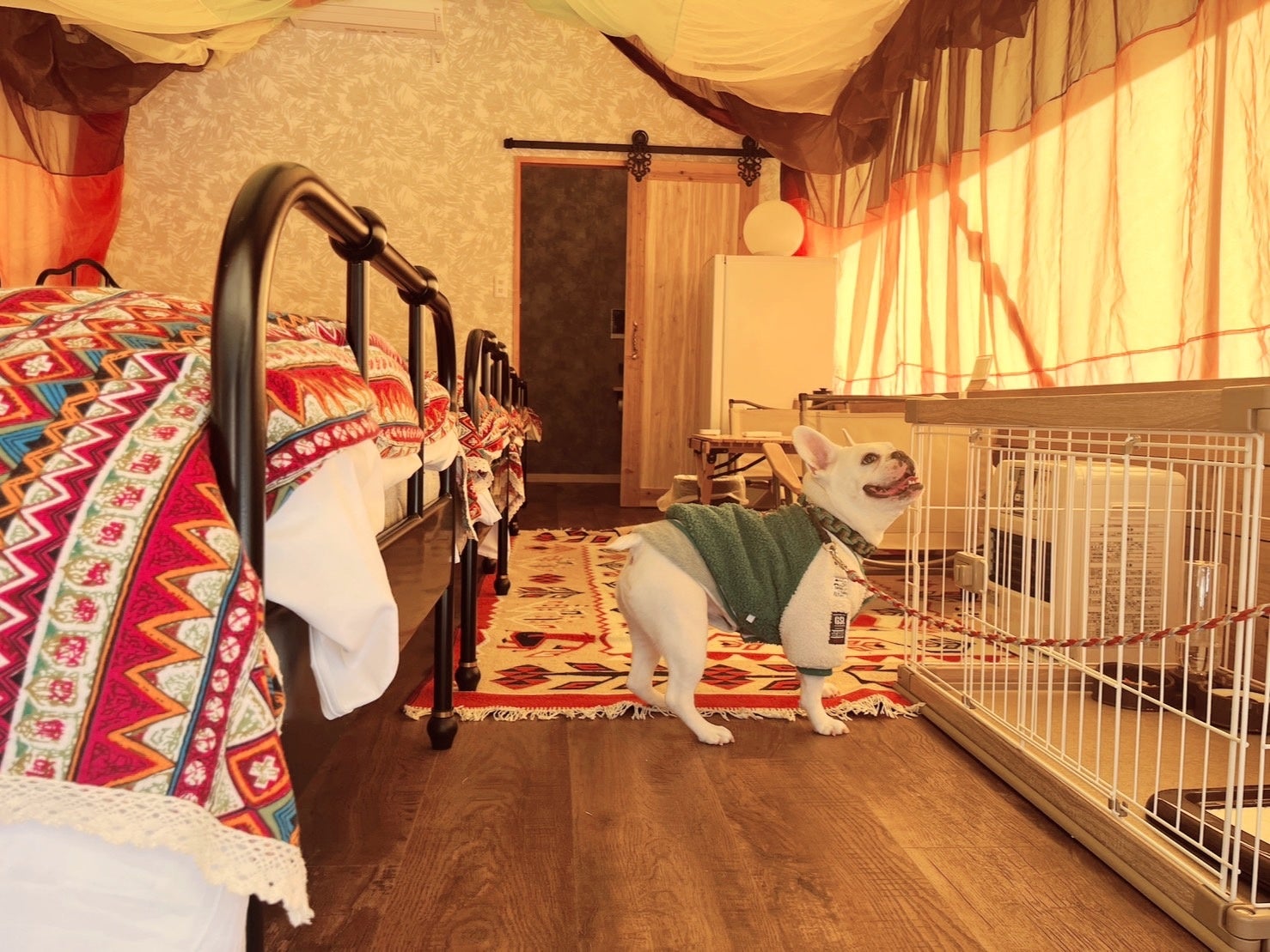 ドッググランピングテントには、ケージ、ペットシーツ、などワンちゃんが泊まれるグッズがそろっており、快適にお泊りして頂く事が出来ます。