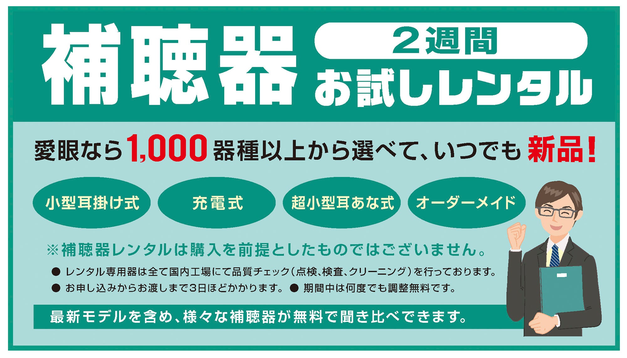 愛眼では、お客様に心からご納得いただいて補聴器をご購入いただきたいという想いから、大好評の「補聴器お試しレンタル」を実施しています。1,000器種以上の新品補聴器の中から、最適な一台をお選びいただけます。ご自宅でじっくり聞こえを体験できるだけでなく、店頭では音質の調整や操作方法のレクチャーなど、専門スタッフが何度でも無料でサポートいたします。