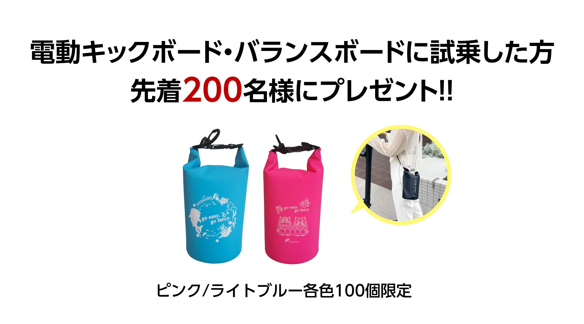 - 電動キックボード・バランスボードをご試乗した方、先着200名様にオリジナル防水バッグをプレゼント