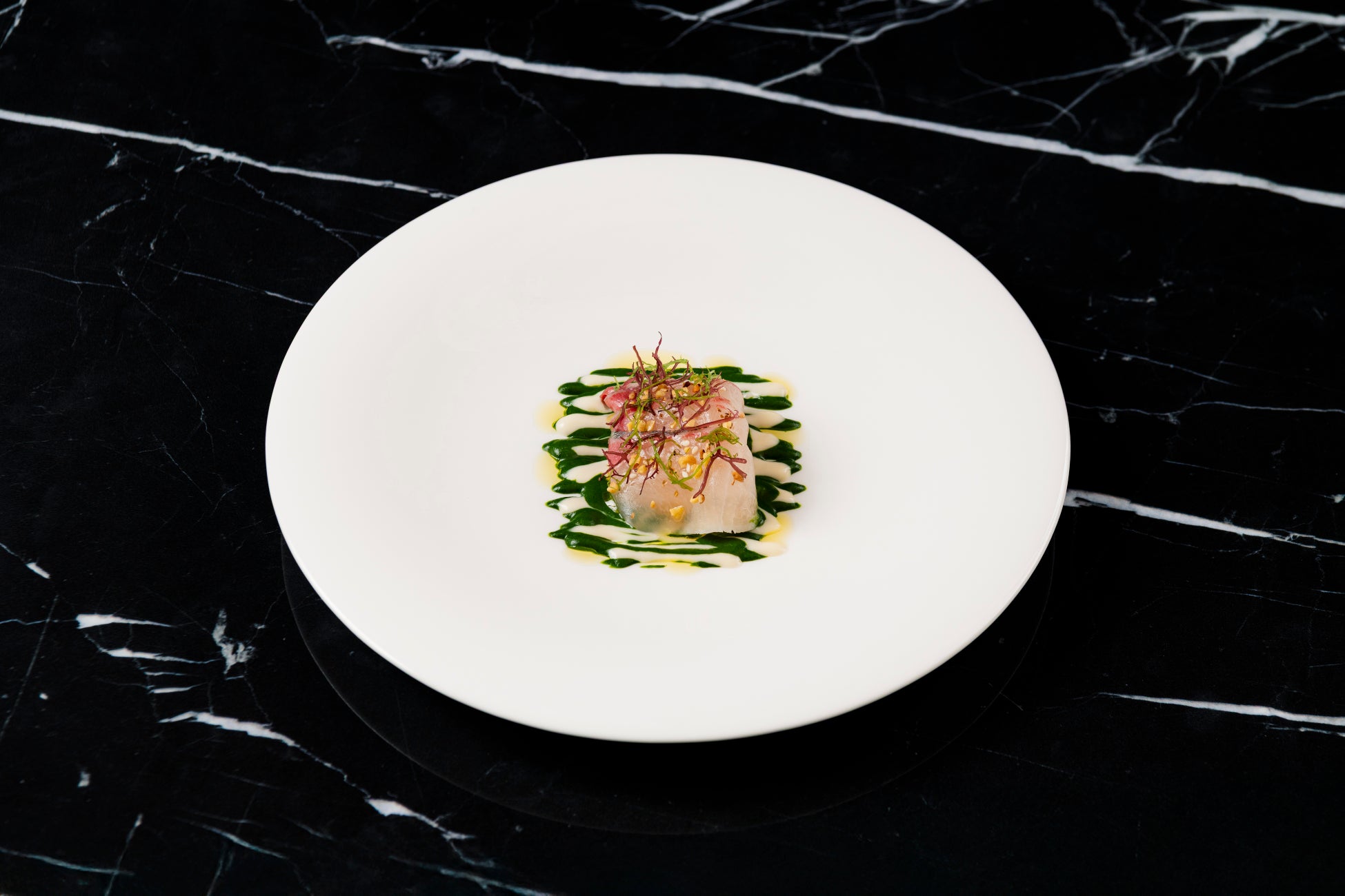 ・冷前菜:〆縞鯵 モロヘイヤと貝のマーブルソース コリンキーのサラダ