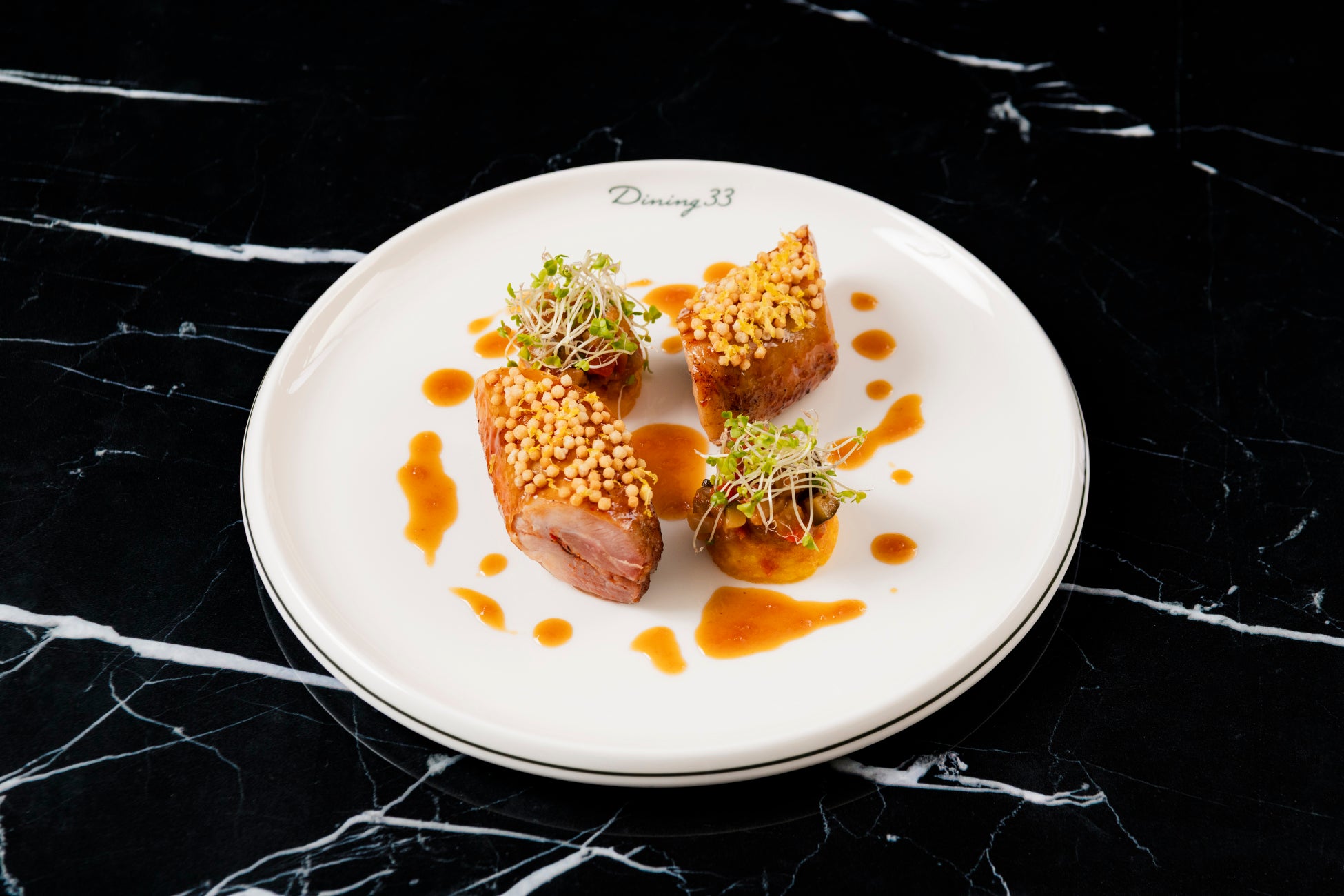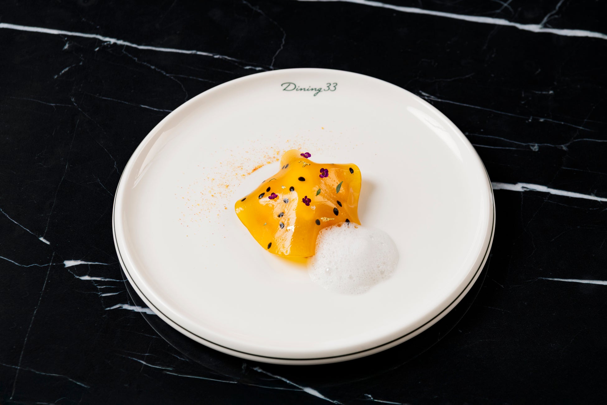 「Dining 33」に併設するパティスリー「Dining33 Pâtisserie à la maison」では、夏だけの特別な新作スイーツ「ペーシュ・メルバ」をご用意いたします。みずみずしく完熟した白桃を木苺の果汁に漬け込み、甘みの中に甘酸っぱい香りを纏わせたコンポートに仕立てております。そこに、瑞々しく爽やかなジャスミンジュレ、ローストしたバニラの芳醇な香りが広がるブリュレ、甘酸っぱいフランボワーズソースを丁寧に重ねました。