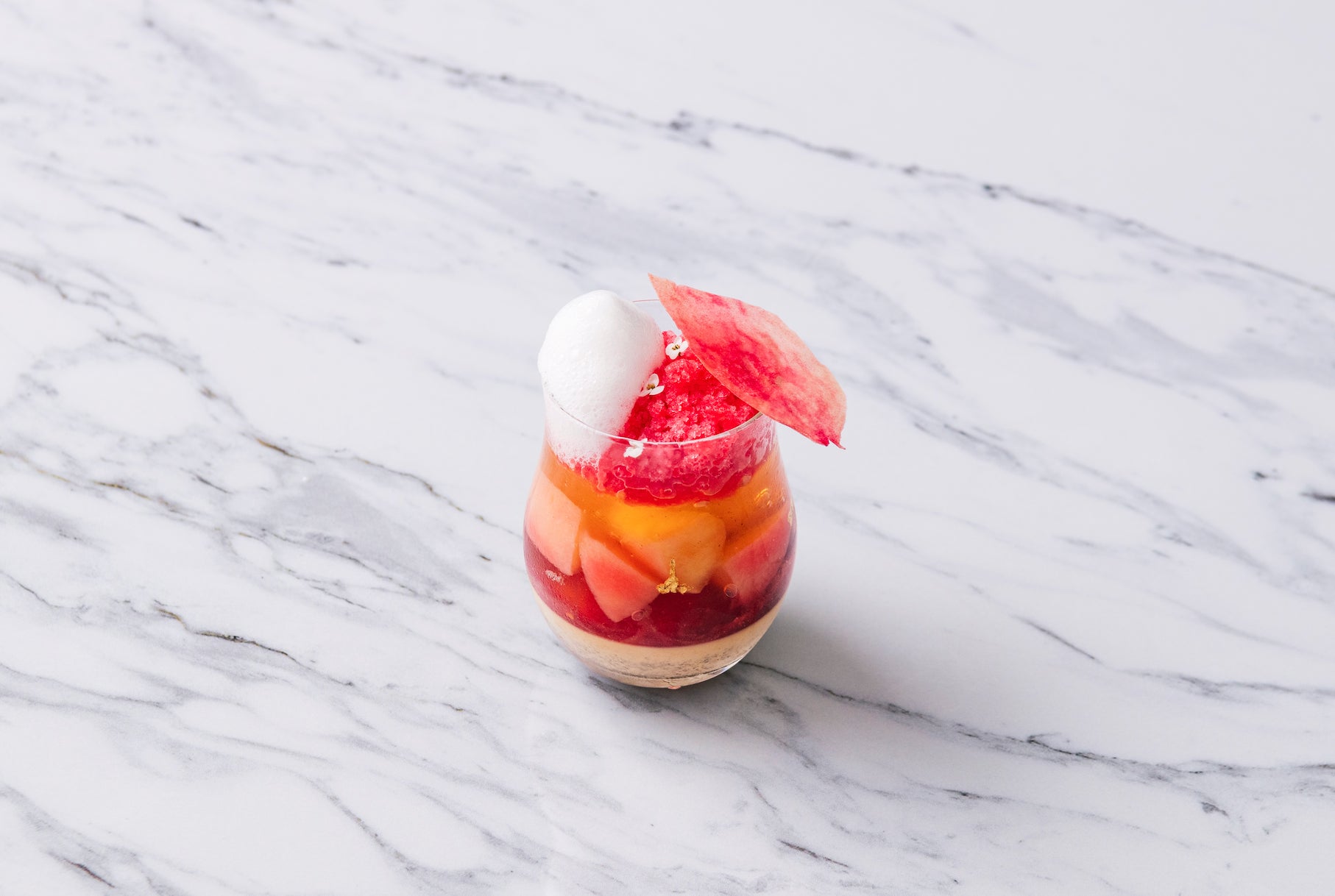 また、「Dining 33 Pâtisserie à la Maison」では、みずみずしく完熟した桃のコンポートを主役にした、グラスデザート「ペーシュ・メルバ」が登場いたします。層ごとに異なる食感と香りが繊細に重なり合い、口の中で甘さがふんわりと広がる、涼やかで上品な一品です。さらに、「Dining 33」のカフェタイム(13:30〜16:00)のイートイン限定で、シャーベット状の氷菓「木苺のグラニテ」を添えた特別仕様でご提供いたします。