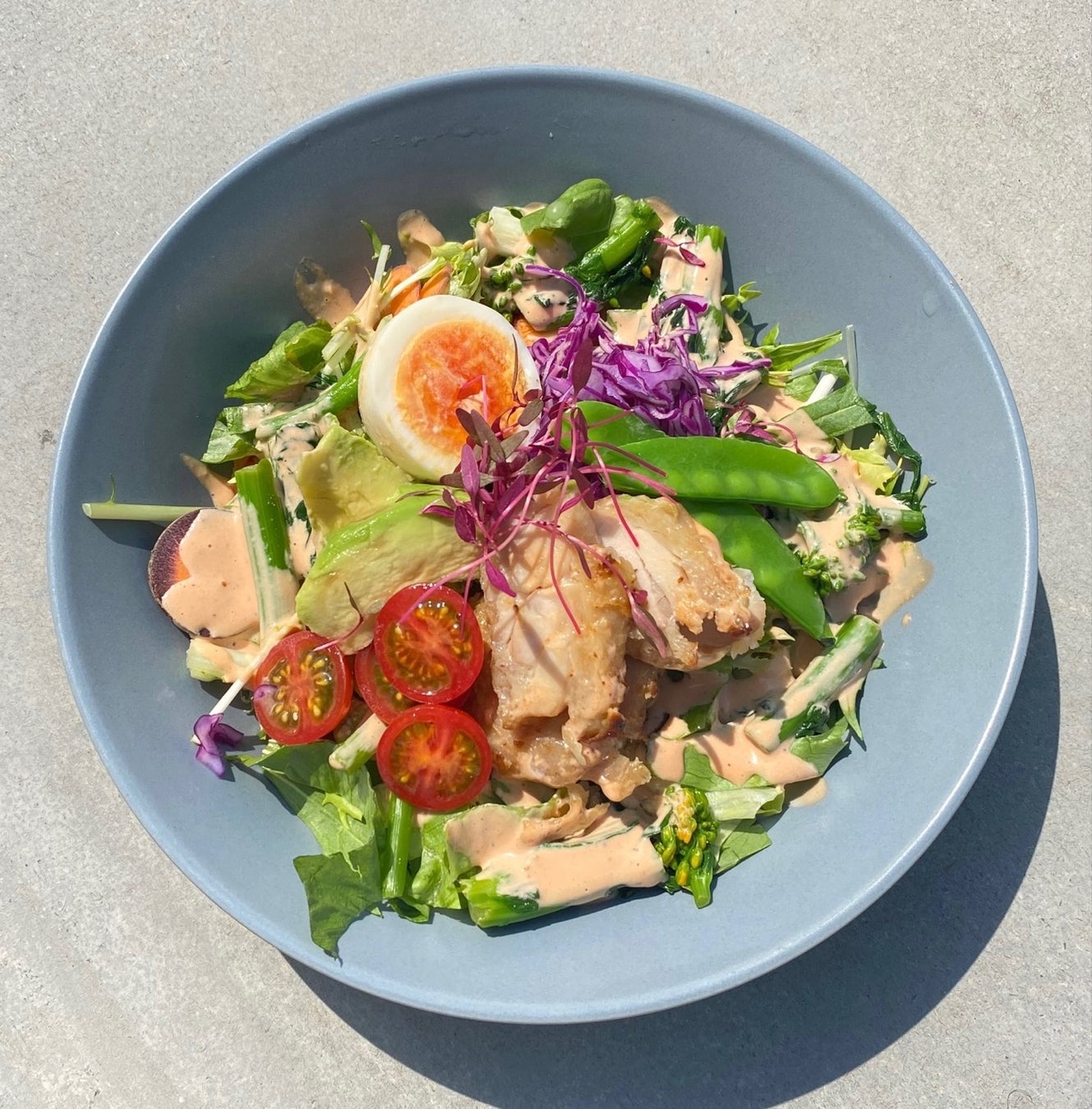 グリーンミックス以外にも、唐揚げや卵、アボカドを取り入れることでタンパク質も豊富に。