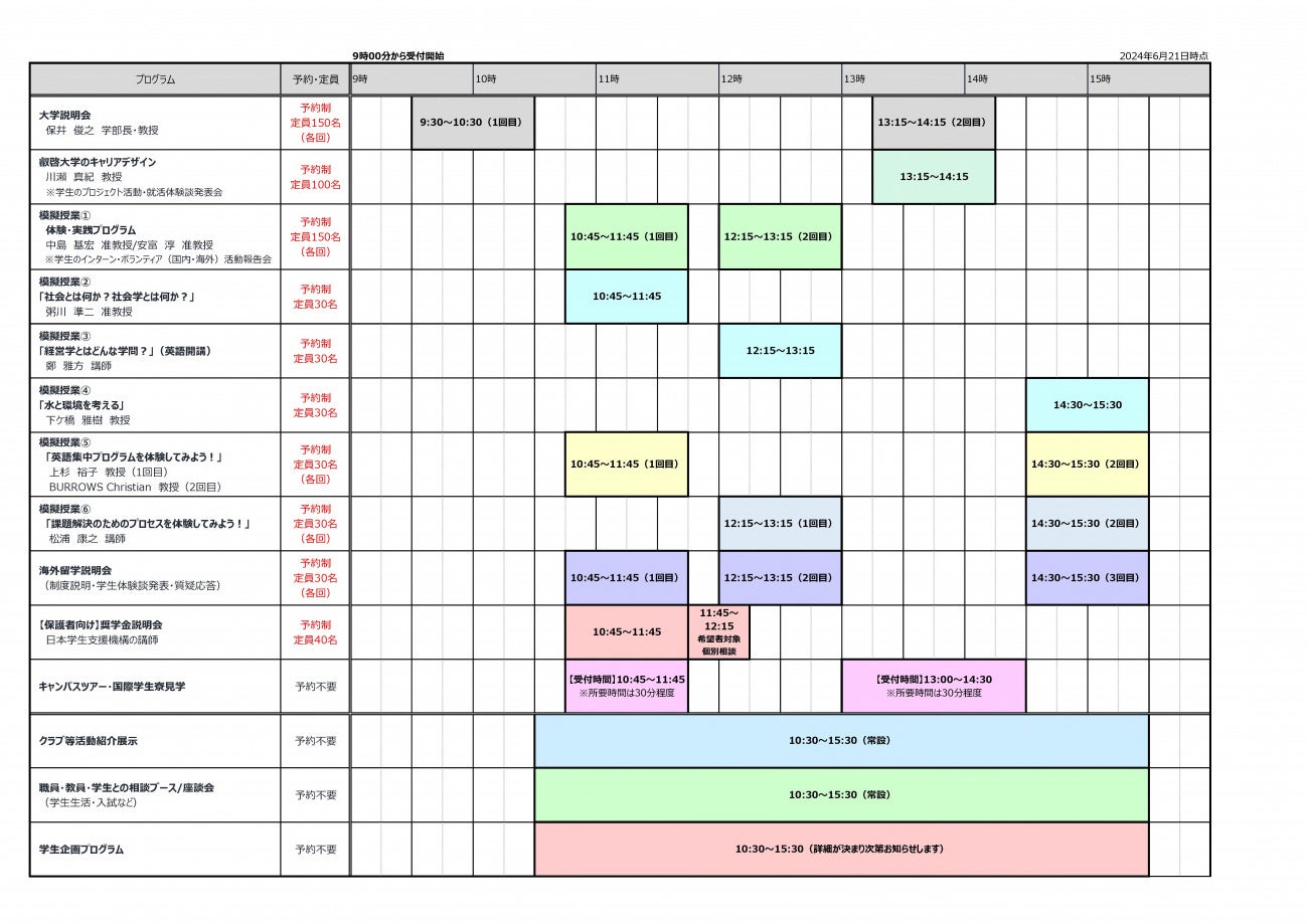 大学説明、模擬授業、学生によるキャンパスツアー、学生生活や留学・入試の相談ブース、学生企画のイベントなどを開催します!