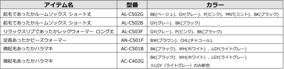人気のあったかルームソックスから、ショート丈が新発売レッグウォーマーなど、足元のあったかアイテムが続々登場!人気のハラマキに新色&新サイズが登場!全10アイテムを新たにラインアップ