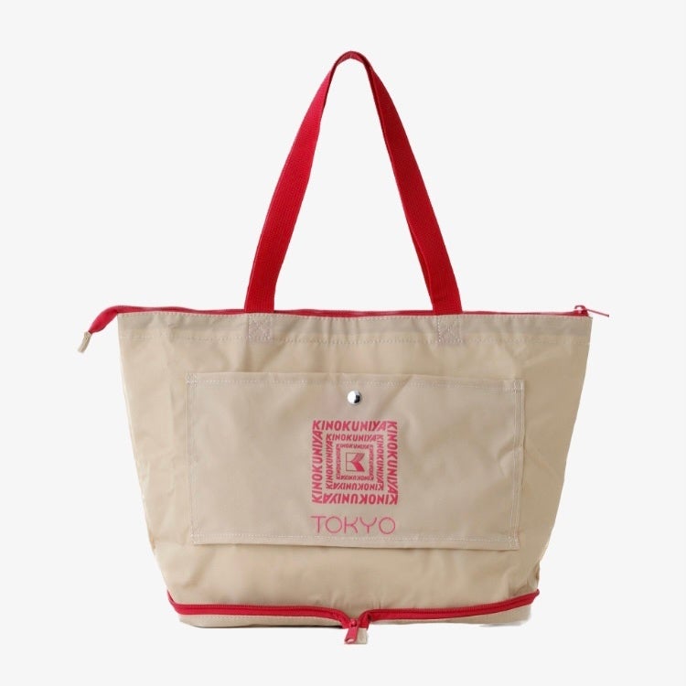 紀ノ国屋のロゴがデザインされた裏面には、キャリーを通す部分に『TOKYO』の刺繍が施されています。お出かけやお買い物はもちろん、キャリーケースに通せる仕様なので旅行時のキャリーオンバッグとしても便利です。折りたたみが可能なタイプなので、スーツケースに収納しておいて必要な時にサッと取り出せるのも魅力です。