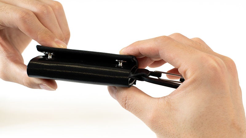 本体は、縦100mm×横37mm(カラビナを除く)とミニマムサイズ。一見するとキーホルダーのようなルックスですが、財布としての機能を持たせるために「カラビナ付き 超ミニレザー財布」には驚くほどの技術とノウハウが詰め込まれています。