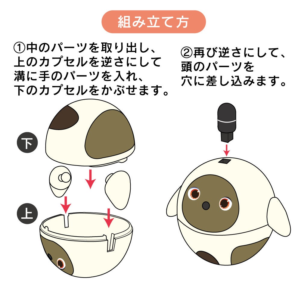 球形のカプセルをそのまま『LOVOT』のボディとして利用し、カプセルの中に封入されているホーンと手先のパーツを組み立てると全高約7.5cm(組み立てた状態、ホーンを含める)のゆらゆら動く、おきあがりこぼしが、第一弾の好評につき新しいカラーで登場します。今回もLOVOTの4種のカラー(うす、ちゃ、こげ、くろ)が揃っており、それぞれのカラーに合わせた特徴的な目と服の色にこだわりました。