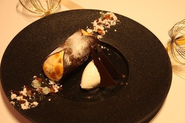 KIKYO パティシエが、世界各国のスイーツに、旬の信州食材を掛け合わせた一皿をご用意しました。第一弾は、⼩⻨粉ベースの⽣地を伸ばして筒状に揚げ、空洞へクリームを詰めたイタリア・シチリア島伝統菓子「カンノーロ」です。南信州特産の市田柿を加えたオブセ牛乳の自家製チーズクリームを詰めました。今後も、国内で海外旅行気分を味わっていただけるメニューの展開を予定しています。
