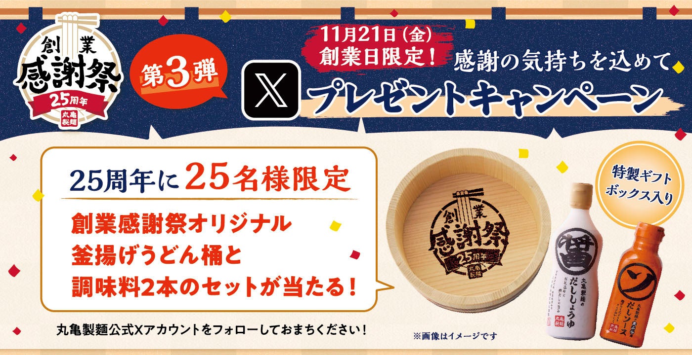 丸亀製麺の創業日である11月21日(金)にXフォロー&引用ポストキャンペーンを実施します。「#丸亀製麺の誕生日を一緒に祝おう」をつけて、今年の丸亀製麺との思い出を引用ポストしていただくと、25周年にちなみ25名さまに、抽選で創業祭感謝祭オリジナル釜揚げうどん桶と丸亀製麺こだわりの『だししょうゆ』と『だしソース』を特製ギフトボックスに入れてお届けします。