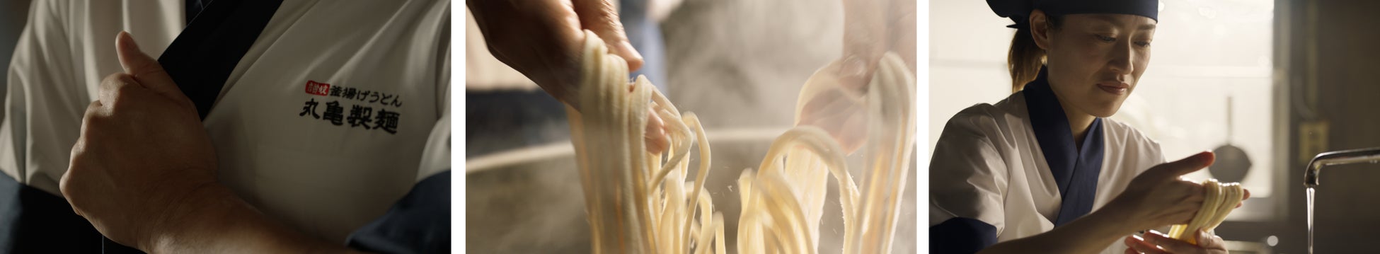 丸亀製麺は創業以来、手づくり・できたてのおいしさに飽くなきこだわりを持ち、毎日すべての店で粉から打つうどんを提供し続けています。その中でも、麺づくりに対して、日々、技と感性を研ぎ澄ます麺職人がいます。麺職人は、その日の気温や気候などによっても味わいや食感に変化が生まれる麺づくりの特性を深く理解し、お客さまに今までで「最高の一杯」をお届けするために、日々腕を振るっています。