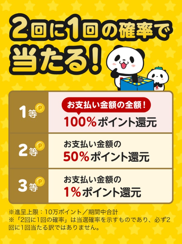 | キャンペーン内容 | キャンペーン期間中に対象店舗にて、「楽天ペイ」アプリによるコード表示・QR読み取りで支払いをされた方の中から、以下の通り抽選でポイントを進呈します。 1等:支払い金額の100% 2等:支払い金額の50% 3等:支払い金額の1% ※進呈上限(10万ポイント/期間中合計)に達するまで何度でも当選可能です。 ※複数回当選した場合、累計の当選額に相当するポイントを進呈します。 ※抽選結果を「楽天ペイ」アプリの支払い完了画面で即時に確認が可能ですが、実際のポイント進呈日は後日になります。 ※抽選結果は通信状況次第で表示できない可能性があります。ただし、キャンペーン参加条件を満たしている場合、支払い履歴に基づいて後日抽選を行い、結果の発表はポイント進呈を以てかえます。 ※「楽天ペイ」アプリで支払い後に、「楽天ペイ」アプリ上で表示される獲得予定ポイントには、「楽天ペイチャンス」で進呈するポイントは反映されません。 ※ポイントは期間限定ポイントで進呈します。 ※同期間に開催されている「1年間ずーっと!毎月全額還元抽選キャンペーン」と重複進呈はしません。重複した場合、進呈される特典ポイント数の多い方のキャンペーンのみが適用されます。 ※「楽天ペイチャンス」の景品進呈対象者は、同時期に行われている他のキャンペーンの対象から除外、または景品総額が景品表示法上の範囲内に制限される場合があります。 ※「楽天ペイチャンス」は「楽天ペイ」アプリによるコード表示・QR読み取りでの支払いを対象としています。下記の支払い分は対象外になります。 - 「楽天ペイ」アプリ内の「楽天ポイントカード」による支払い分 - 「楽天ペイ」アプリ内の「楽天Edy」へのチャージ分、「楽天Edy」による支払い分 - 「楽天ペイ」アプリ内の「Suica」へのチャージ分、「Suica」による支払い分 |