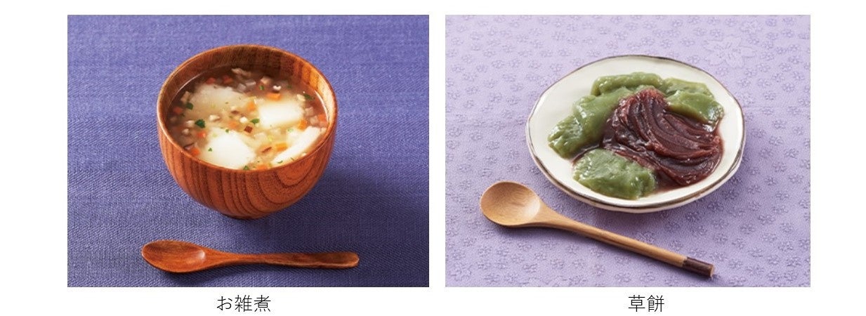 ・かむ力や飲み込む力が弱い高齢者でも食べやすいかたさに仕上げており、餅が伸びないのでスプーンですくって食べることができます