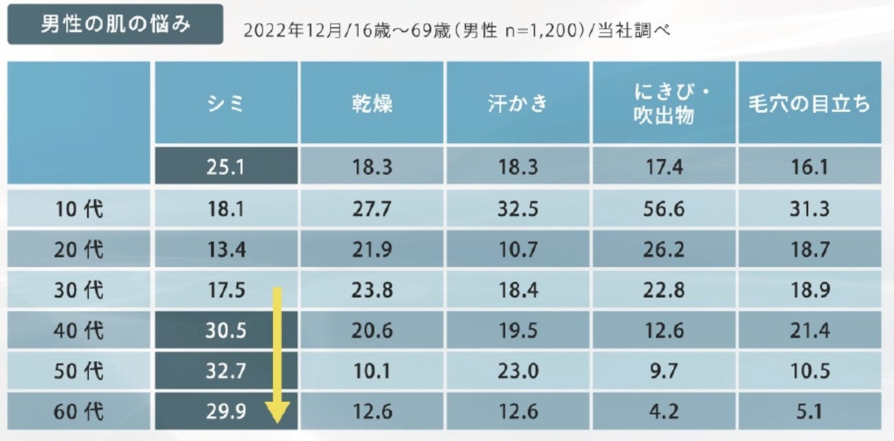 『マニフィーク』は、オーガニック植物や、生命の源である海、香草、海藻をはじめとする大自然の恵みをふんだんに取り入れた“ネイチャーサイエンスケアブランド”です。近年多様化するニーズに応え、スキンケア効果や使い心地にこだわりジェンダー問わずお使い頂ける“ジェンダーレス発想”によるスキンケア・ヘアケア商品を展開し、その存在感を高めてきました。男性の肌悩みは「シミ」が最も多く、特に30代以降、その割合が大きくなっていることから、「シミ対策」にフォーカスした高機能スキンケアを発売することでスキンケアのラインナップ強化をはかり、ブランドの新たな愛用者の獲得を目指します。
