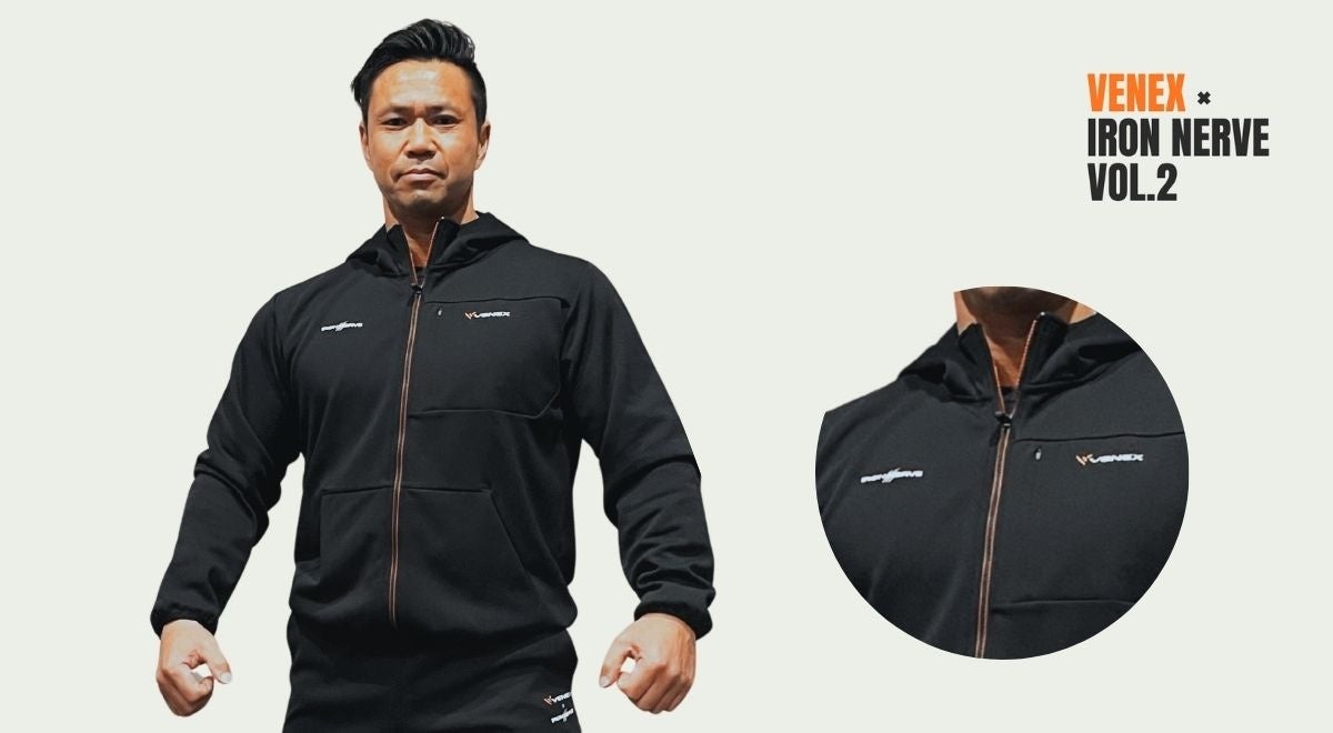 左胸には「VENEX」のロゴ、右胸には「IRON NERVE」のロゴをプリント。