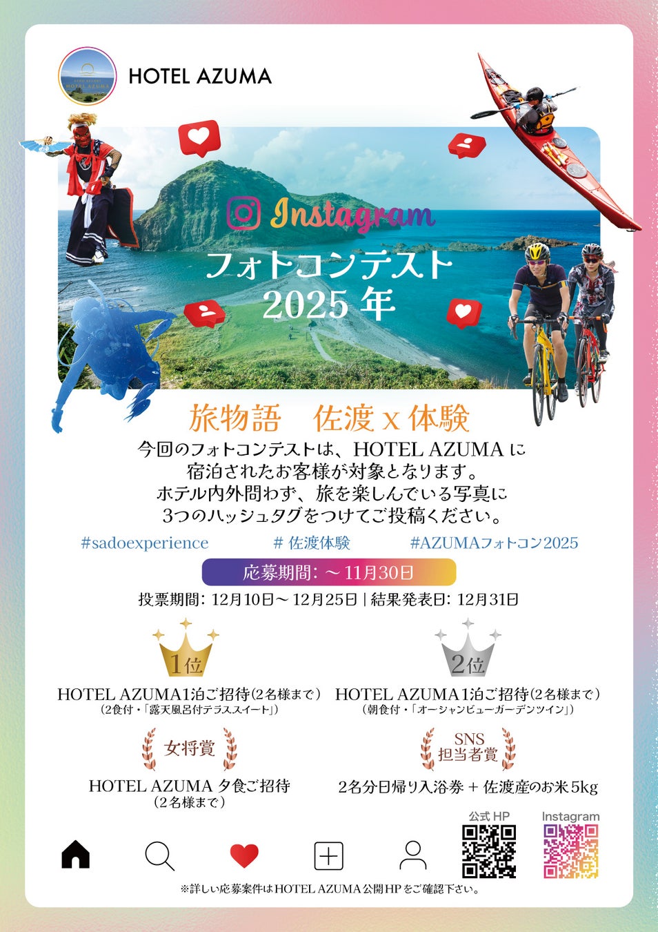 この度のフォトコンテストのテーマは「旅物語 佐渡 × 体験」です。ご参加の際は、HOTEL AZUMAのInstagramアカウントをフォローし、ハッシュタグ「#sadoexperience」「#佐渡体験」「#hotelazuma」を付けて、皆様のアカウントから投稿していただきます。⼊賞された⽅には、HOTEL AZUMAご宿泊招待券などを贈呈させていただきます。