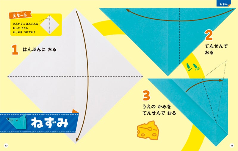 折り図の写真は、一般的な 15cm×15cmの折り紙で折ったときの原寸大です。折り線や角度、折り幅がはっきりわかるので無理なく「できあがり」までたどりつくことができ、お子さんの達成感までの道のりを、やさしく、しっかりとサポートします。