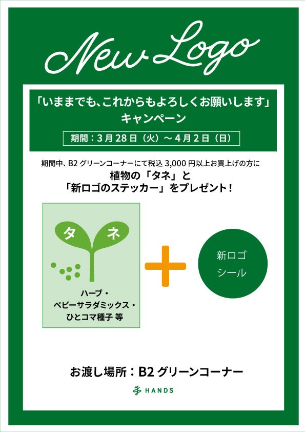 3月28日(火)~4月2日(日)までの期間中、B2グリーンコーナーにて、税込3,000円以上お買い上げの方に、植物の「タネ」と「HANDS新ロゴシール」をプレゼント!
