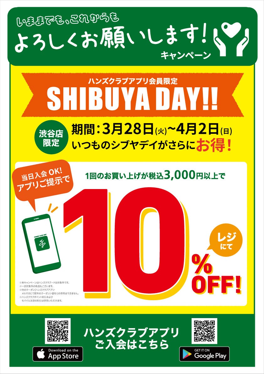 ハンズクラブアプリ会員限定、1回のお買い上げが税込3,000円以上で、レジにて10%OFF実施。いつものシブヤデイがさらにお得!