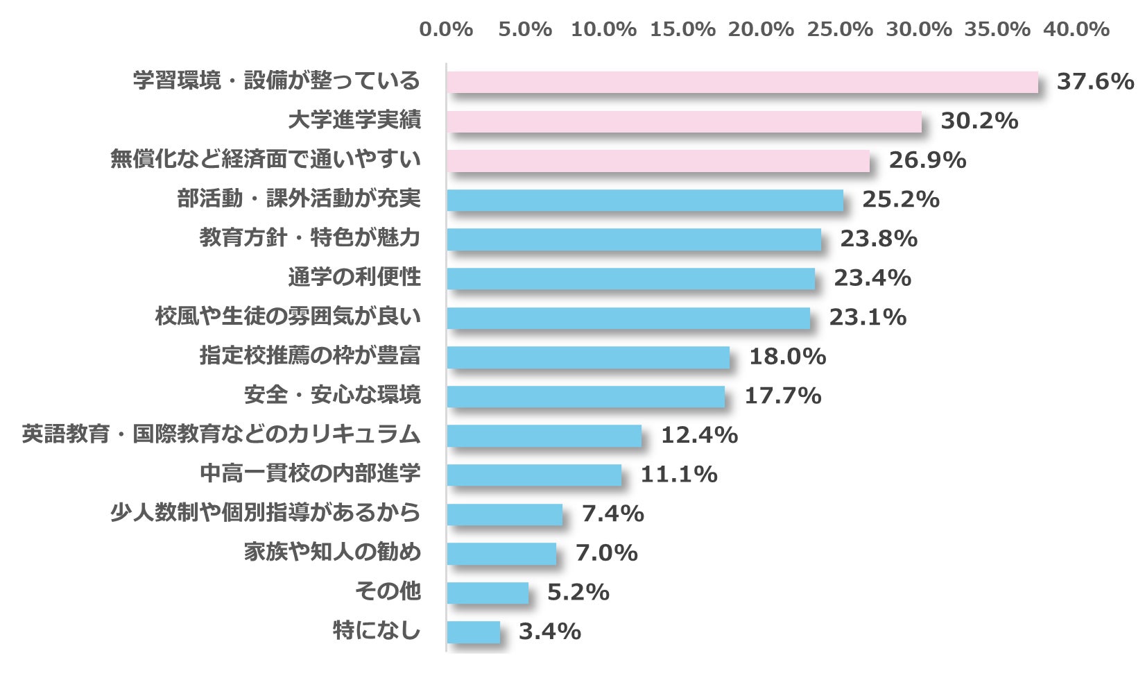 子どもが私立高校を志望する理由について調査したところ、最多回答は「学習環境・設備が整っている(37.6%)」、次いで「大学進学実績(30.2%)」、「無償化など経済面で通いやすい(26.9%)」と続きました。また、自由回答では「公立高校の滑り止めとして受験する」といった声も複数寄せられました。