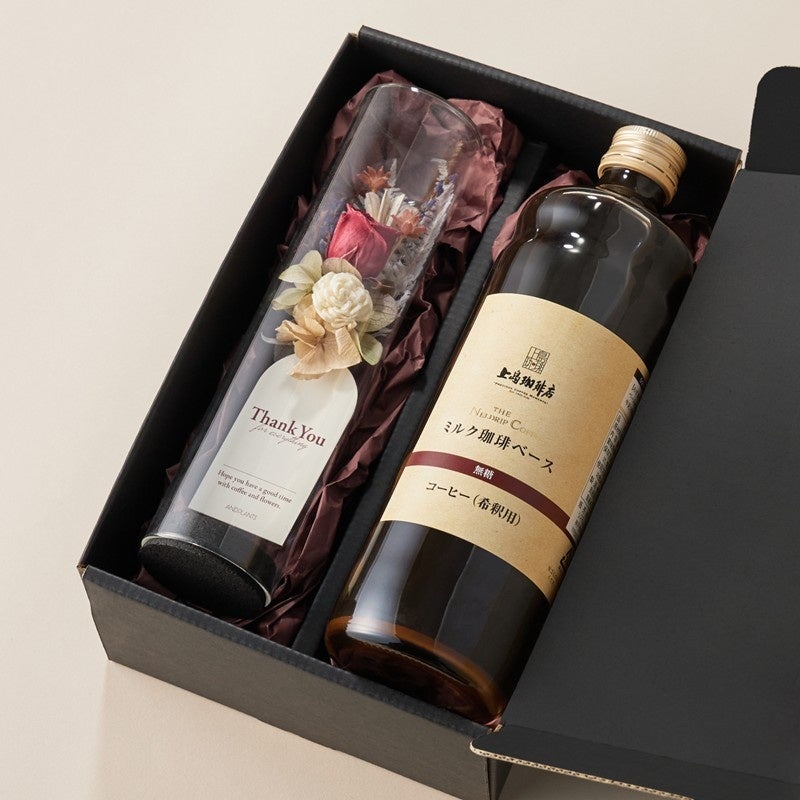 上島珈琲店の看板メニューである『ミルク珈琲』の味わいを、ご自宅で手軽に再現できるコーヒーベースと、ガラス瓶入りの華やかなフラワーボトルのセット。フラワーボトルには「thank you」のメッセージタグが付いているため、感謝を伝えるプレゼントにぴったりです。ギフトボックスを彩る「母の日デザインシール」をご選択いただけます。