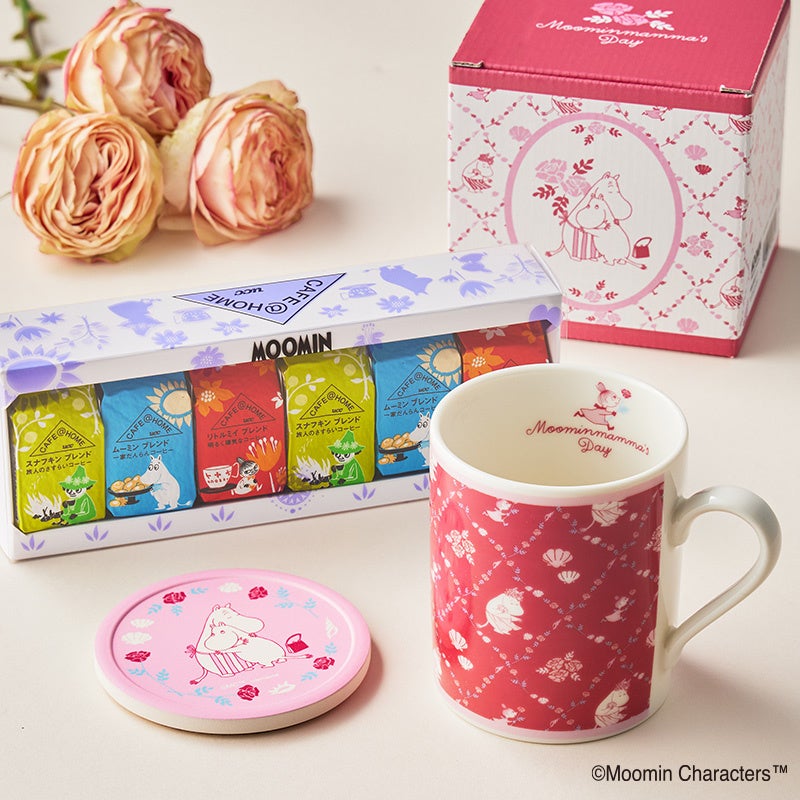 また、COFFEE STYLE UCC株式会社が販売する、UCC独自技術「フレッシュキューブ※2」で1杯分ずつ真空パックしたワンドリップコーヒー『CAFE@HOME(カフェアットホーム)』のバラエティ豊かなコーヒーと、上品なローズカラーが目を惹く限定マグカップ&コースターを組み合わせた、母の日限定のムーミンギフトセットも数量限定で登場します。ムーミン谷の仲間たちとともに、香り高いコーヒーをお楽しみいただけます。