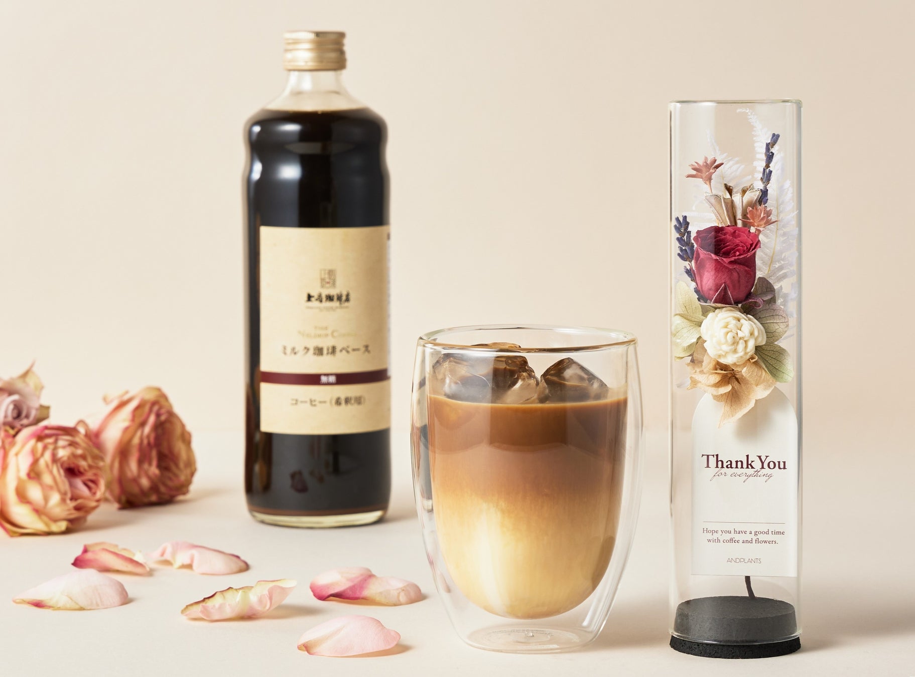 今回UCC公式オンラインストアから発売する母の日ギフトセットは、年間1万本以上を売り上げた※1「上島珈琲店」の 人気アイテム『ミルク珈琲ベース』を中心に、数量限定で展開します。『ミルク珈琲ベース』は、上島珈琲店の看板メニューである『ミルク珈琲』の味わいをご自宅でも手軽に再現できる希釈タイプのコーヒーベースです。感謝の気持ちを伝えるメッセージタグ付きのプリザーブドフラワーボトルとセットにしたギフトのほか、味わいのお好みに応じて選べる『ミルク珈琲ベース』2本セットの2種類をご用意しました。いずれも黒を基調とした専用のギフトボックスにてお届けします。
